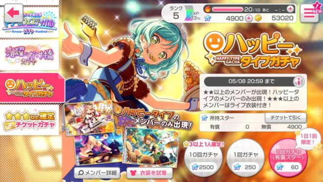 お次のガチャは『ハッピータイプガチャ』だ。どうやらバンドリのメンバーは同一人物でもタイプ(属性)があるらしい。ハッピータイプのメンバーが少なくて欲しい人はこれを引けばいいのかな?