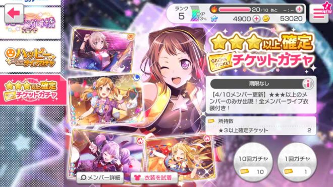 最後はチケットガチャだ。これはレア度の高いキャラクターが必ず出現するというガチャだね。俺はチケットを持っていなかったから引けないとばかり思っていたけど、いつの間にかログインボーナスで2枚手に入れていたみたい。このガチャはスターを全部使い切ってから引こう。投稿のネタとしても温存しておきたい(笑)。