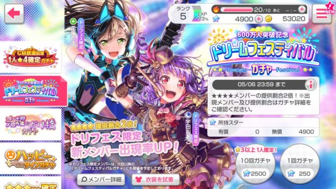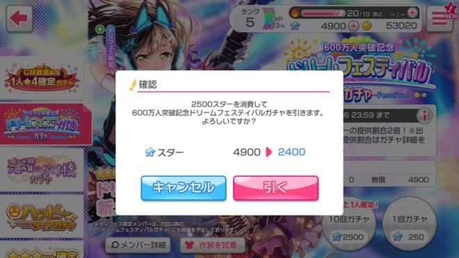 次は600万人突破記念のドリームフェスティバルガチャだ。俺以外にも5999999人がガルパをプレイしているのか。なんだか胸が熱くなるなあ。このガチャはドリームフェスティバル限定のキャラ出現率が高いらしい(たぶん)。うーむ、限定メンバーが手に入るとなれば引きたくなってしまうね。