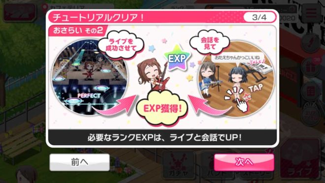 ランクを上げる経験値はライブと会話で取得できる。ランクもメインストーリーが解放される条件かもしれない。マメにエリアで会話を見るようにしようぜ。