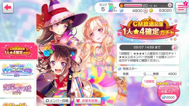 一番上から見てみよう。まずは『CM放送記念1人★4確定ガチャ』から。このガチャは10回引けば必ず1人はレア4メンバーが出現するというものだ。しかし、僕は引くことができない。ログインボーナスで手に入れた無償スターは使えないからね。有償スター(課金をして買ったスター?)が無いとダメなのである。