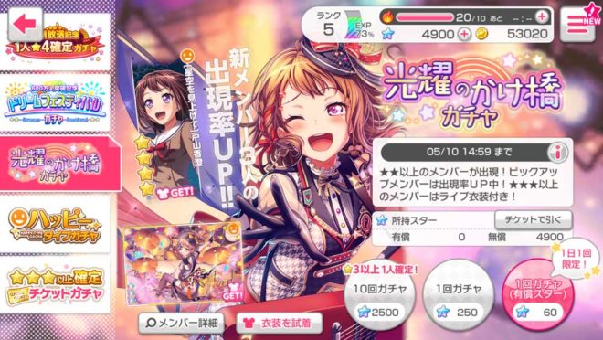 画像枚数の関係で★3のメンバーだけを紹介しました。他の結果は★2のキャラクターです。ポピパのりみちゃん(ベース)は持っているはずだがタイプが月(?)だからNEWマークがついているのね。えーと、もう画像を10枚以上貼ってしまったので今回はここまでにします。次回もガチャを10回引いてしまおう!スターが100足りないけどなあ。