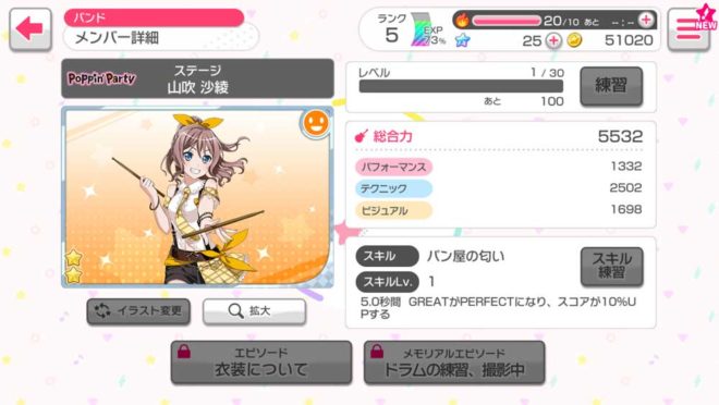 ガチャの結果は上の画像になります。画像枚数の関係でレア3のメンバーだけを紹介しました。うーむ、よく見てみると同じ女の子が出現している?例えばポピパのドラムである山吹さんが2人います。同一人物のレア2でも何種類かあるようですね。タイプの数だけ存在するのでしょうか?ちょっと山吹さんの能力を見てみましょう。