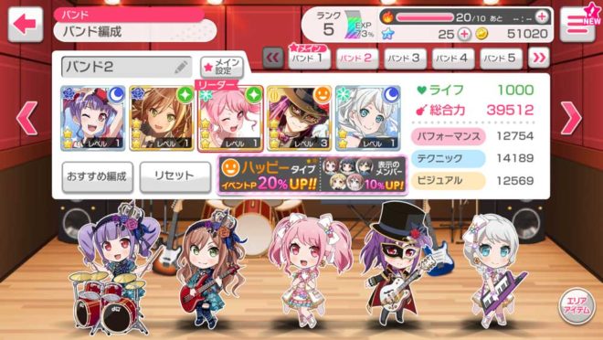 せっかくだからイベントに挑戦をしてみましょう。ベースを先ほど手に入れたレア3の今井さんに代えておきます。北沢さんもレア3だけど瀬田さんと同じ『ハロハピ』のメンバーだから『ロゼリア』の今井さんにしました。