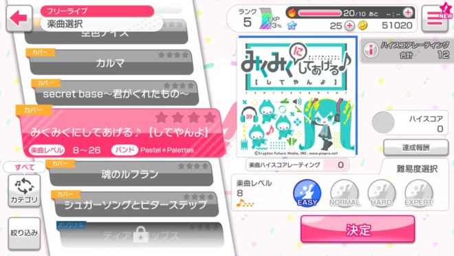 さて、イベントのライブでは自分が持っている楽曲を演奏するようです。事前に購入しておいた初音ミクの曲を選択しますね。これってボーカルを変えると同じ楽曲でも歌い手が変わるのかな?分かりません!無課金でここまで楽しめるなんて怖くなってきました。