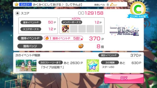 以上のようにライブを繰り返してイベントポイントを積み重ねていくわけですね。あと630ポイントあればスターを貰えるみたい。ポイントでストーリーも解放をされるのか。これは何度も挑戦したくなっちゃうよね。バンドリって無課金でも相当遊べるんじゃないかなあ。