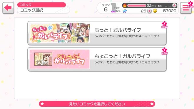 上の画像はバンドリのメニュー画面です。『コミック』というボタンが気になってしょうがない!もしかしてアプリの中で漫画を読めるの?それは凄いぞお。