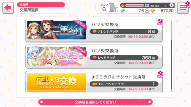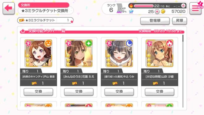 交換所にてミラクルチケットを選択しました。これは好きなメンバーと交換できるチケットか(笑)。こんなん欲しいに決まっていますよ!音ゲーの実力があればイベント中に好成績を出してミラクルチケットを手に入れられる→無課金でも強いメンバーを手に入れられる・・・のかなあ?