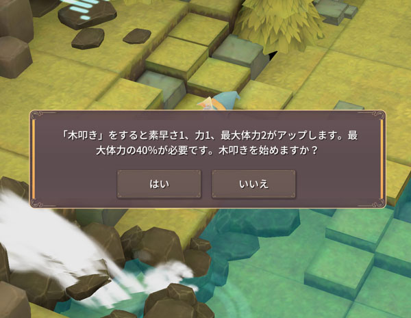 修練は外にある構造物に近づくと実行できるそ。魔力を上げる修行場所はどこにあるんだろう。まあいいや、木叩きをします!