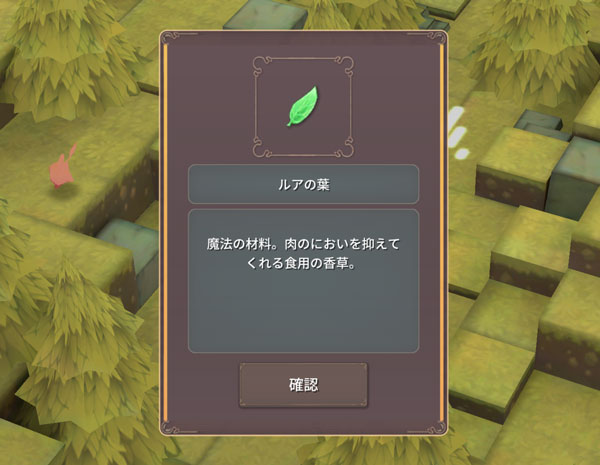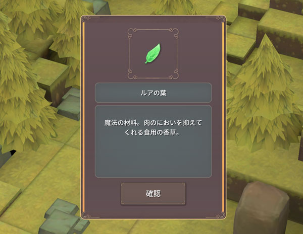 ルアの葉は肉のにおいを抑えてくれるそうです。美味しそうな料理を作れそうですね。まあそれよりも魔法の材料と書かれているのが気になる。前作の樹液のように他の合成素材になりそうだ。