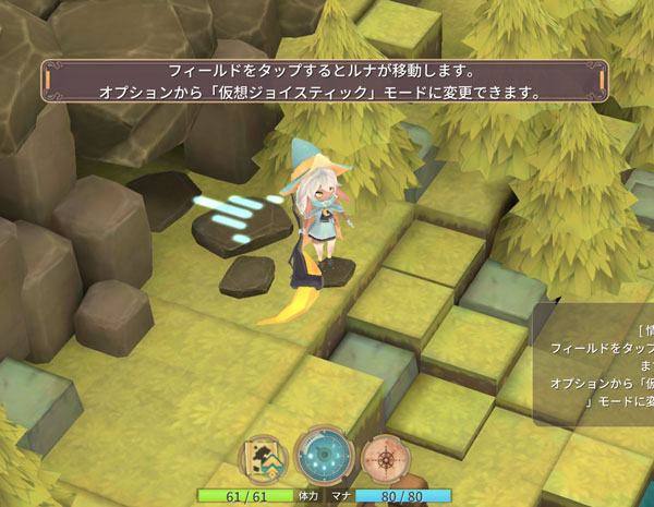 フィールドをタップするとルナを移動させられます。これは前作と同じだから理解しやすかった。ただ仮想ジョイスティックモードってのは初めて聞いたな。申し訳ない。あんまりゲームをやらない人間だから分かりません!