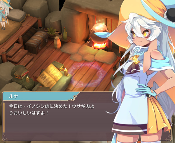 献立はイノシシ丸焼きかあ。最大体力が5くらい上がりそうですね。戦闘が始まるかもしれません。ルナは氷の魔法が得意だったはずだ。ここでぶっ放すのかな。