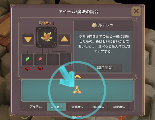 現在、表示をされているのはルアレツの材料です。ここで『火炎魔法』→『魔法陣』の順番にタップすると?