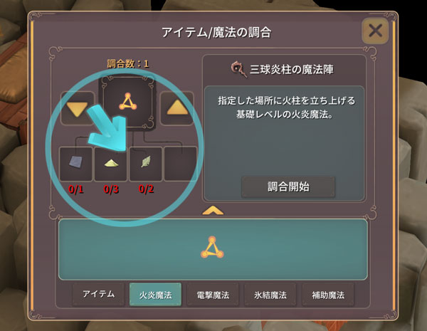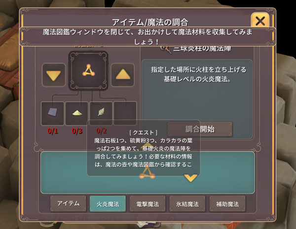 火炎魔法に必要な材料を確認します。パイベリーの時は魔法の石版、その辺の葉っぱ、近所の砂を素材にしたはず。あの石版をどこで拾ったのか疑問に思っていました(笑)。