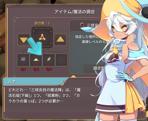 基礎火炎の魔法陣を調合するクエストが開始しました。ぶっちゃけどこに行けば良いのか分からん(笑)。まあ外に出ればルナが教えてくれるでしょう。