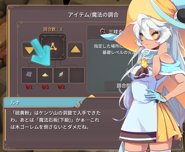 ルナが3つの材料について解説をしてくれました。採取できる場所も知っていそうだよね。