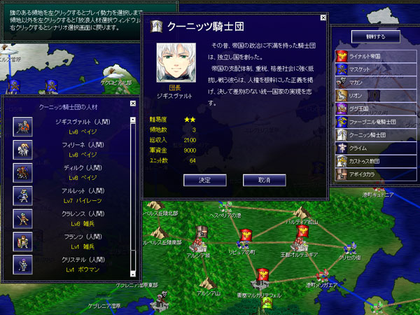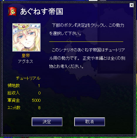 アグネス帝国の指導者は皇帝アグネスです。イケメンですねえ。見るからにカリスマがありそうだ。ただしチュートリアルシナリオは本編とは別物らしい。本編に皇帝アグネスが登場をするのかは不明。『決定』ボタンを押してチュートリアルを始めます。
