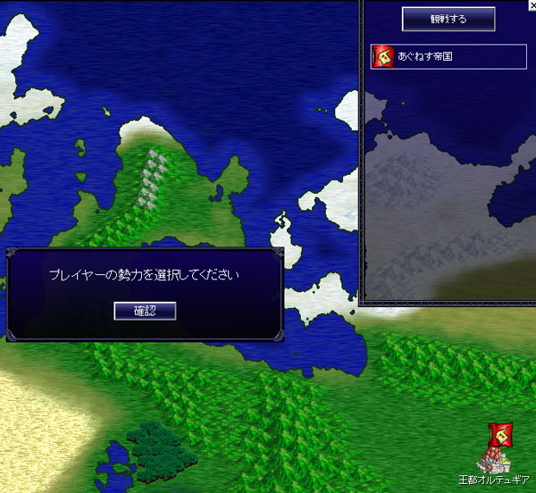 チュートリアルを開始してゲームを覚えてしまおう!プレイヤー勢力の選択画面が表示されました。王都オルテュギアを拠点とする『あぐねす帝国』しか選択できません。『あぐねす帝国』を選ぶぞー!!