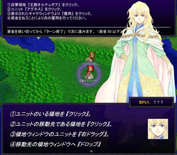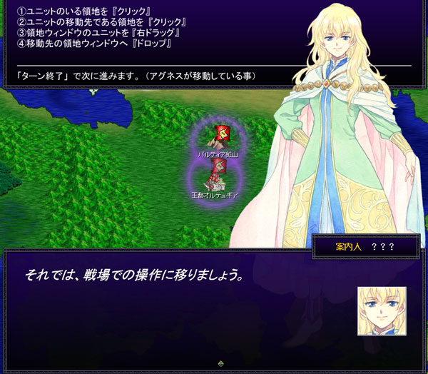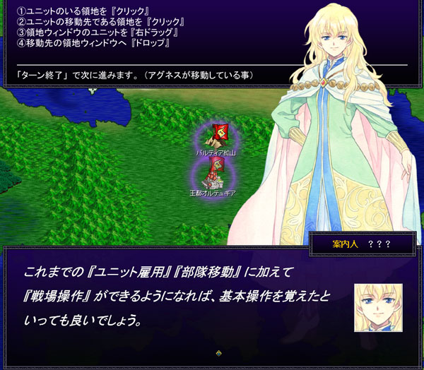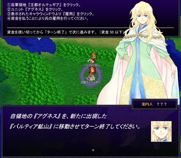 チュートリアルは王都オルティギアにいる『アグネス』を『バルディア鉱山』へ移動させれば達成。ユニットを敵領地に移動させて攻め込む時の練習です。