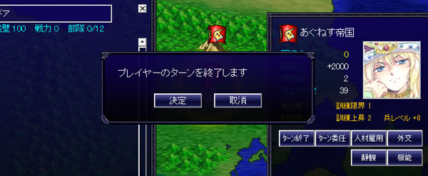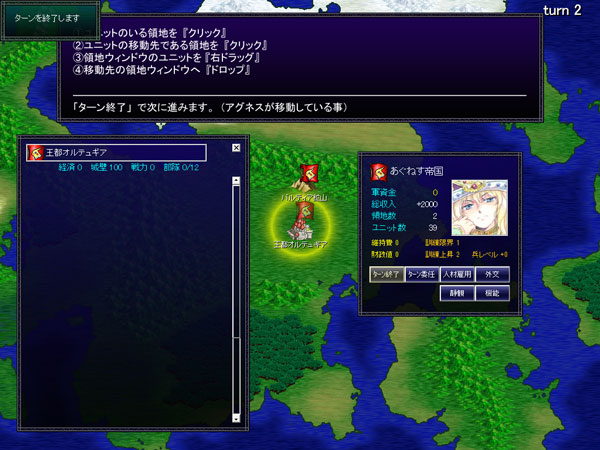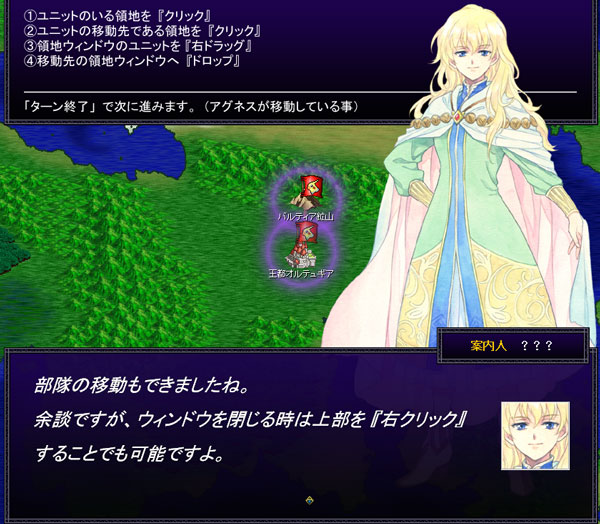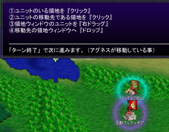 ターンを終了して『移動』のチュートリアルを終わらせます。今回は自軍の領地から敵領地へユニットを移動させる方法を学びました。