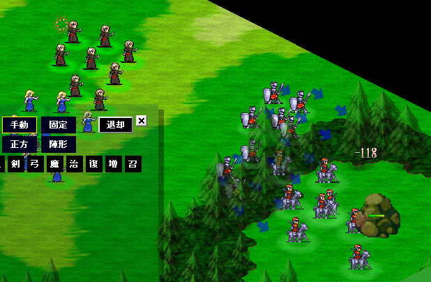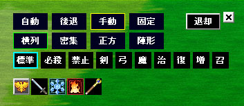 上の画像に表示をされている『剣』~『召』がスキルになります。あとは陣形や部隊の状態を指定するコマンドです。下にある絵(アイコン)を左クリックでそのスキルだけを使用。右クリックでそのスキルだけ使用禁止です。