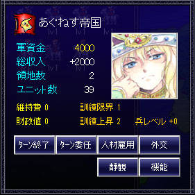 人材雇用ボタンは上のウィンドウにあります。軍資金や総収入が表示をされる勢力のメインウィンドウです。