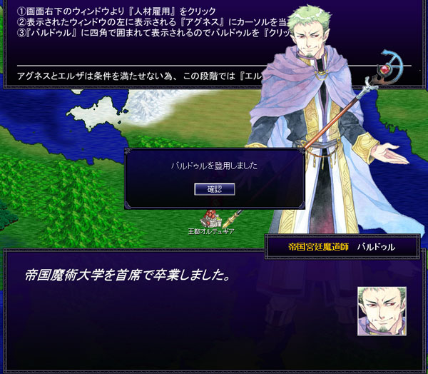 ③のバルドゥルのクリックを実行する。これでバルドゥルが仲間になりました。帝国魔術大学を主席で卒業をしたダンディーなオッサンです。本編をプレイした際も仲間にしたいですね。