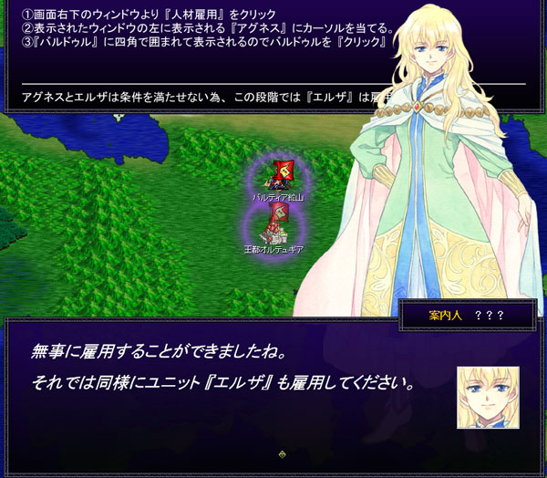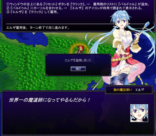 エルザの登用に成功しました。ユニットには性別があり雇用条件に影響をするそうです。他の細かい設定については実戦で復習をしよう。次回は人材雇用の補足と訓練を学びます。