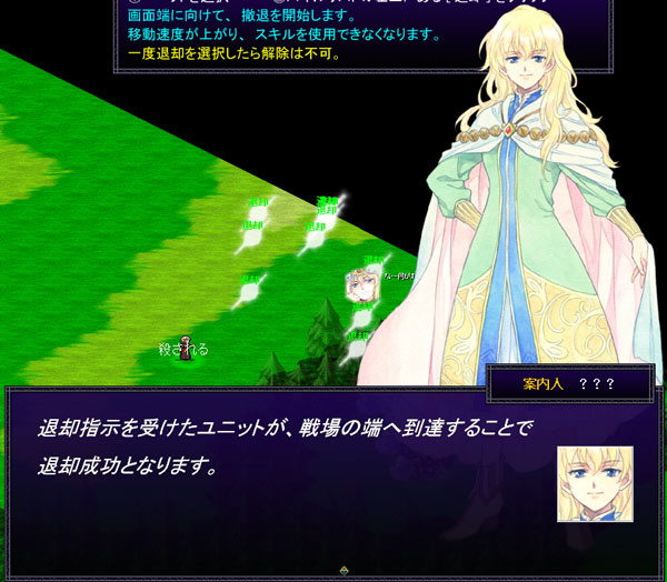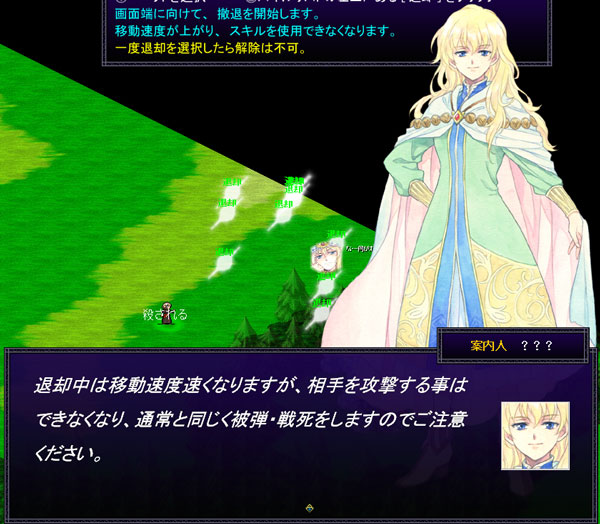 退却中は移動速度が上昇をするらしい。そのかわり攻撃はできないから無防備になるのですね。危険極まりないコマンドだが良いのです。常に勝利すれば使うことは無いのだから。