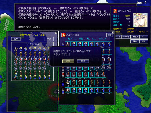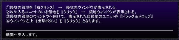 侵攻元(自軍領土)をクリックすると画像画像右のウィンドウが出現。ここから①の侵攻ウィンドウへユニットを移動させます。