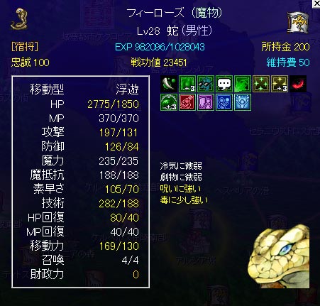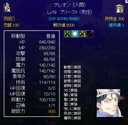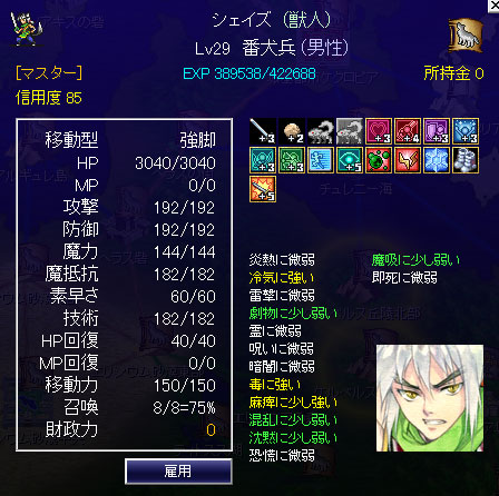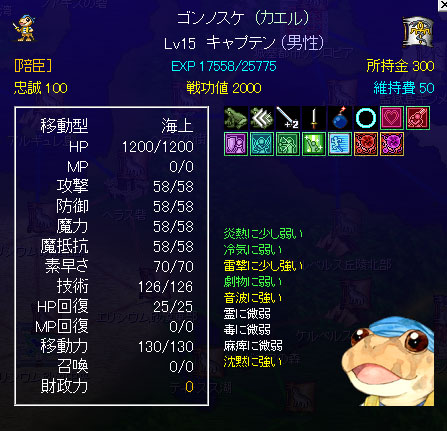 ゴンノスケはカエルですね。雇える人材の範囲が広くて驚いた(笑)。レベル15にしては能力が低いなあ。代わりに強いスキルを持っているのかな。