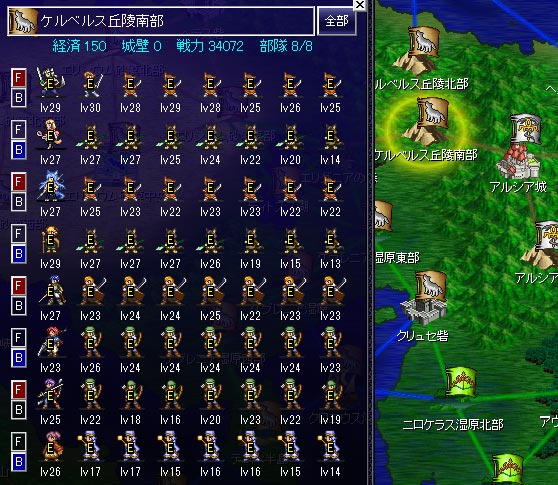 カストゥス教団と交戦した精鋭はケルベロス丘陵南部にいます(上の画像)。ラルスの配下が凄い早さでレベルアップをしている。あいつらがほとんどの敵を倒していっぽいぞ。