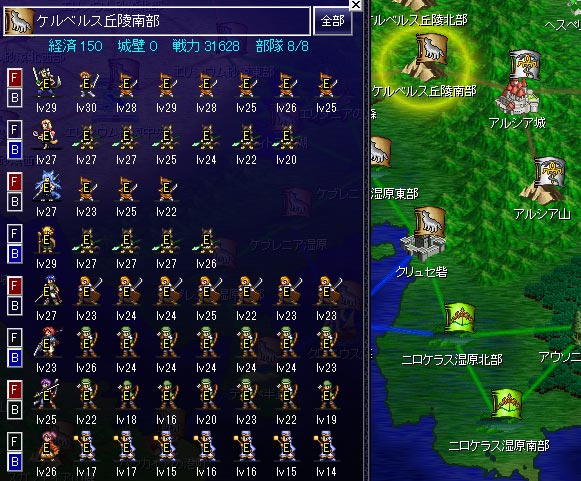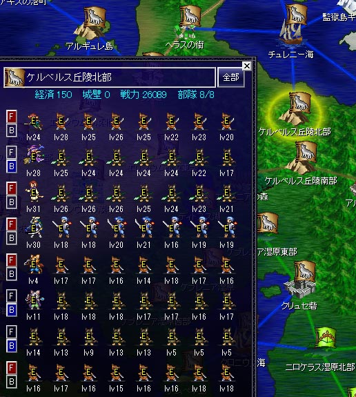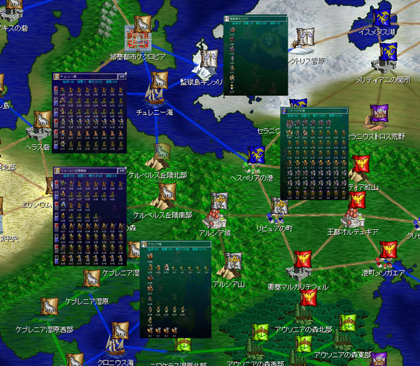 次のターンにはカストゥス教団を滅ぼしてしまいたい。最前線の都市、ケルベロス丘陵南部には最強のユニット達を集めました。