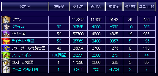 クグ王国、ライナルト帝国、カストゥス教団は共闘の同盟を結んだ連合国です。リオンの国力は圧倒的になったが中原の制覇は手こずりそうだね。