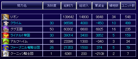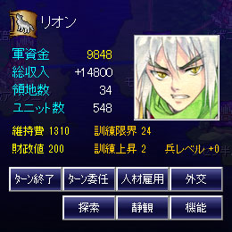 収入、戦力、ユニット数、全ての値においてリオンは最強だ。最近は人材ユニットが加入してくれないから寂しい。