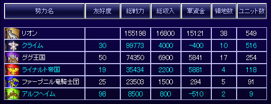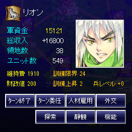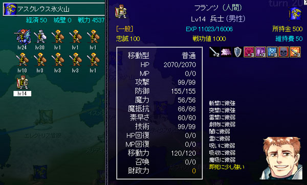 登用をし損ねたフランツはファーブニル竜騎士団に取られました。ググ王国に登用されなかったのは幸いだったと言える。カエル達に取られたらゲーム終了間際まで取り返せない。