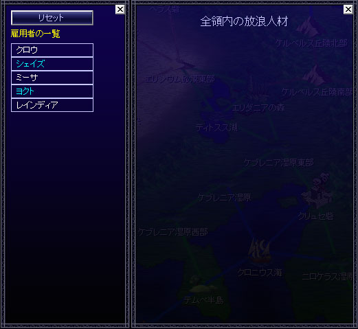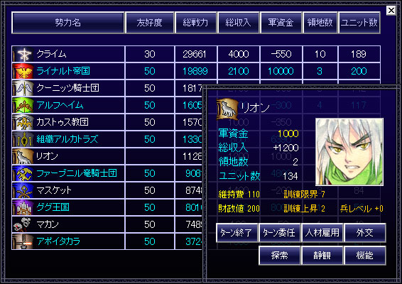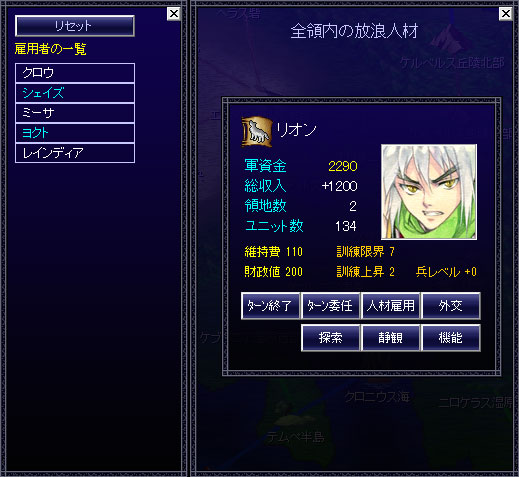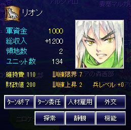 ちょっぴり期待をしつつ領内の人材を探す。放浪人材はいなかった(泣)。かつての仲間はリオンを見捨てたんだよ!他の勢力に仕官をしていたらぶっ倒してやる。