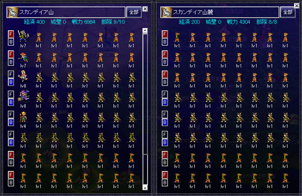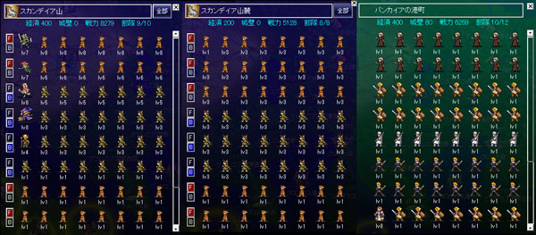 街ごとに雇えるユニット数が決まっています。『8/8』のスカンディア山麗で雇用を選択すると上の画像みたいに怒られちゃう。このゲームはユニットクラスごと、隊列ごとに部隊が管理をされる。最初はちょっと戸惑いました。
