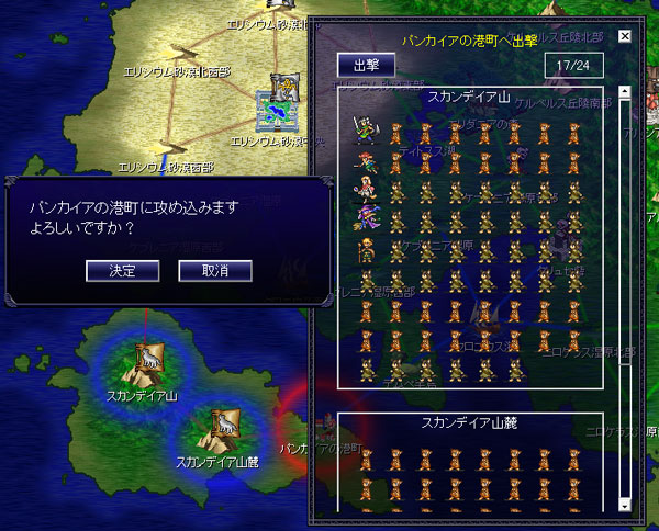 このターンは雇用無しで全軍攻め込みました。ユニットを数体雇用をすれば次ターンに訓練できる。当時は気づかなかったんだから仕方ない!戦闘を開始します!