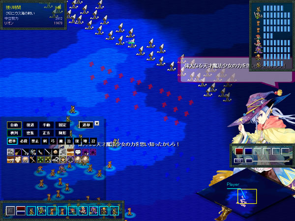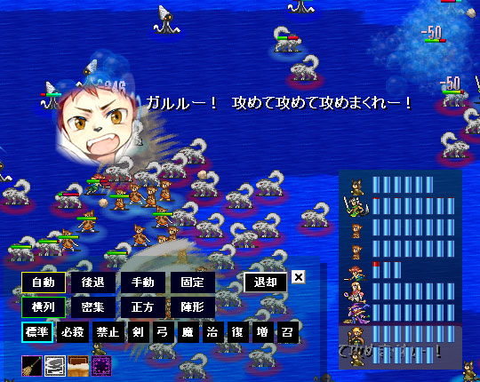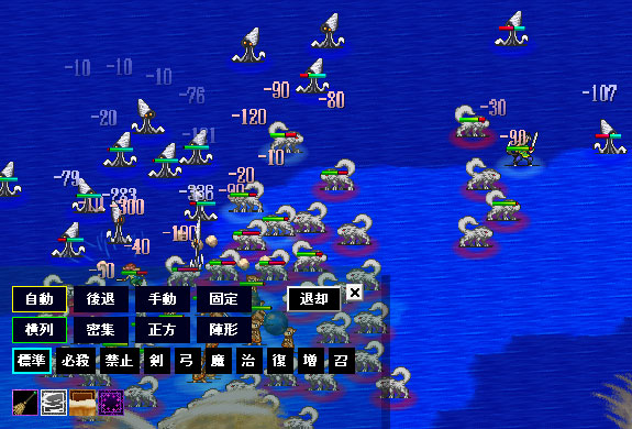 敵の戦力を616まで減らしました。そろそろ勝ち鬨を上げる時ですな。プレイ当時は気づかなかったけどイカには移動力DOWNの効果が付与されない。耐性を持っているのか?それとも海では地術の能力が封じられる?