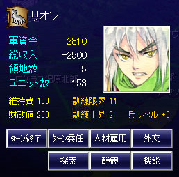 リオンは滅ぶ寸前だった勢力なのです。プレイをしているとそれが伝わってきます。領土を広げても新たな放浪人材が現れる気配はない。イベントも悲しくてやるせない会話が多い。