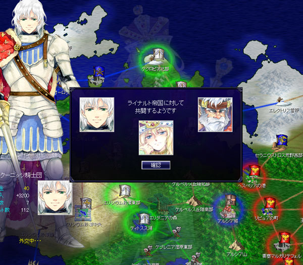 クーニッツ騎士団とヒゲマッチョが帝国に対して共闘の同盟を結びました。このゲームは外交により敵対勢力を打倒することもできます。