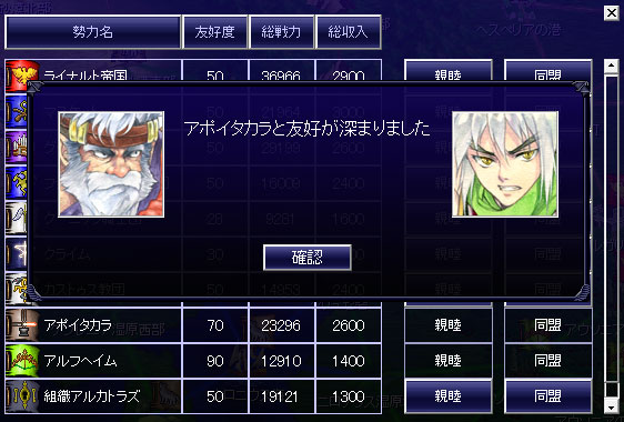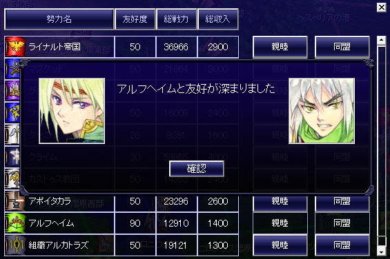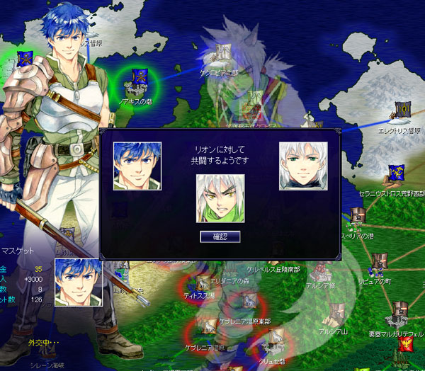 マスケット(青いアニキ)、カストゥス教団(砂漠のヒゲ)と隣接をしました。このまま大陸西側へ進行をしよう。中央へ進むとキツいってのは俺でも分かる。帝国を抑えている勢力と外交をします。