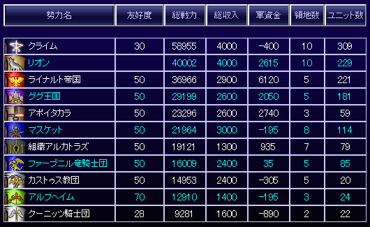 マスケットとクーニッツ騎士団が対リオン同盟を組んだようです。あと1ターン早ければ脅威だった。もう砂漠にクーニッツ騎士団の領土は残っていないよ。
