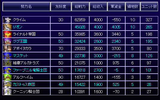 総戦力、収入、領地数はトップを独走している(クライムを除く)。だが総戦力4万5千では足りないのだ。それをこれから思い知ります。