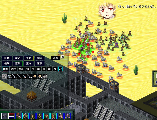 後列の地術師が精霊を召喚してリオンの戦力は3万に増えました。それは良いのだけど敵の戦力が195しかない。もしかして退却中ですか?