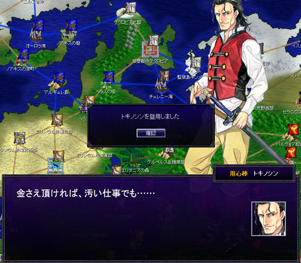 一番下にいたトキノシンをクリックしたら登用できました。こいつはパンカイアの港町の住人です。かつてシェイズ達を弾圧した因縁があるのだ。なんと仲間になってしまった。