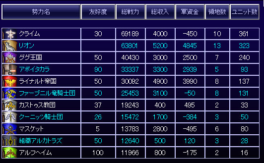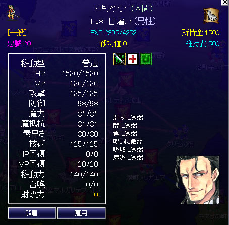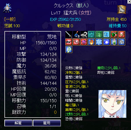 能力値はそこそこ高いけどスキルが少ない。リーダースキルが無いから部隊を率いるのには向いていません。今回のプレイ日記はここまで。次回はケモミミを雇用してターンを経過させます。