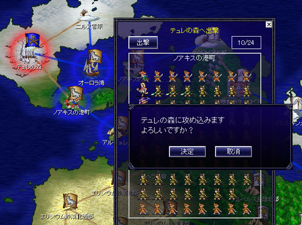 それではノアキスの港町にいる全てのユニットを進攻させます。シェイズ、コリー、ヨクトなど主力キャラが不在だから心配になってくるね。クロウの突撃スキルに期待をしたいです。