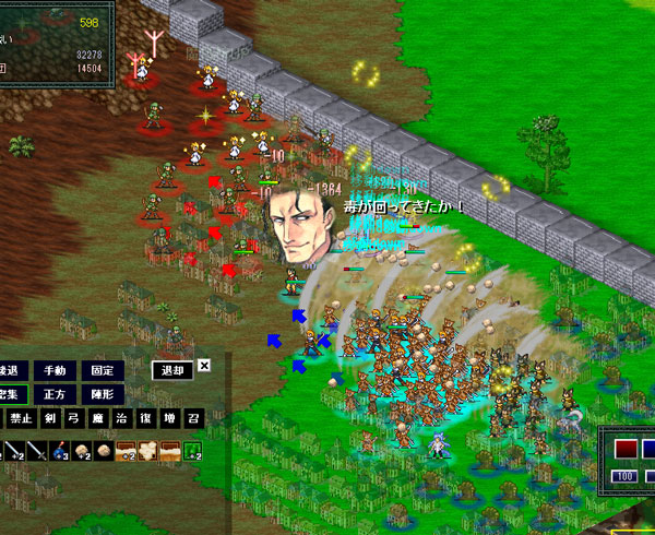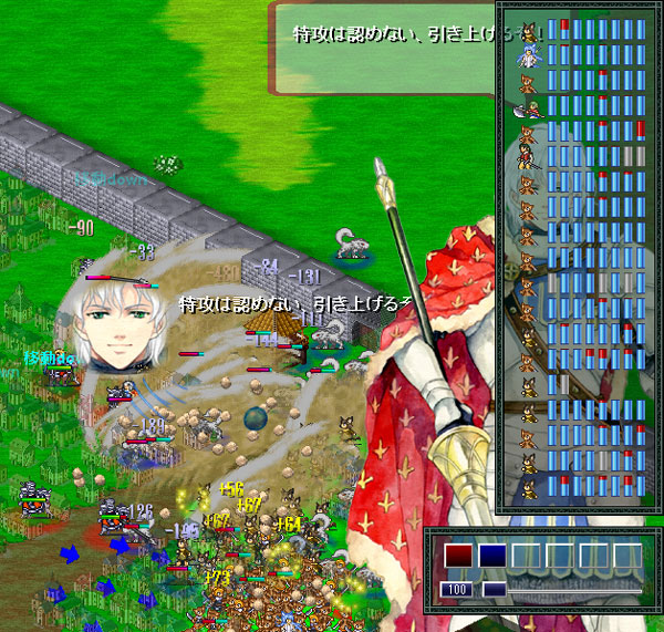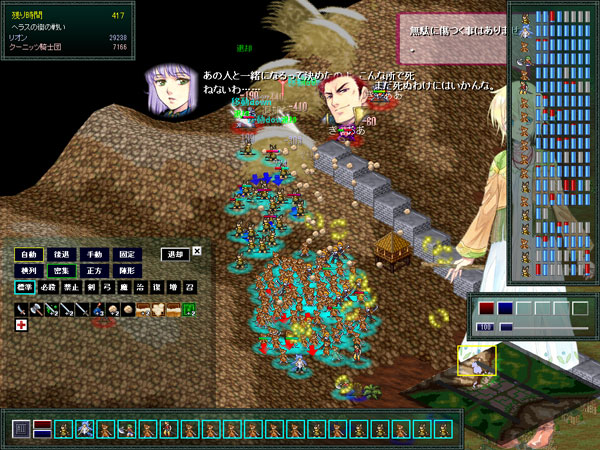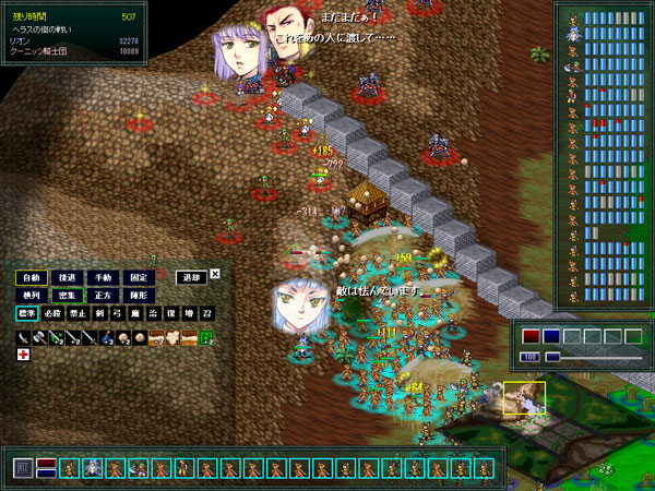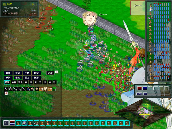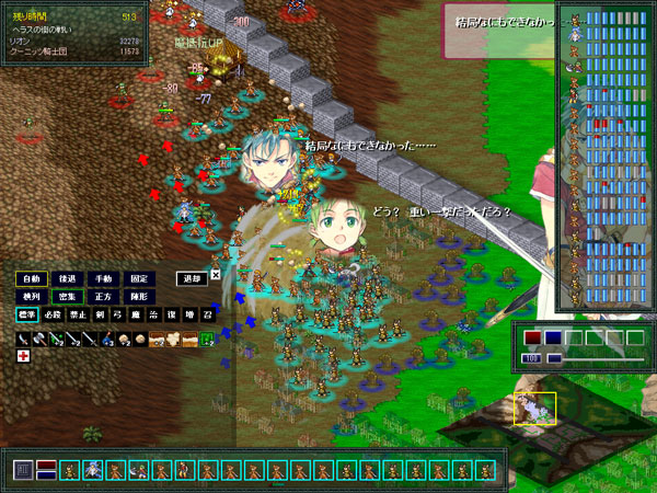 LostTechnologyのプレイ日記を始めます。ヘラスの街にてクーニッツ騎士団と交戦中!騎兵隊が暴れまわり前線の召喚獣は全滅しました。なにやら人材ユニットらしきドットキャラが近づいています。